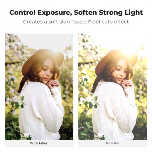 - * 【VND og svart diffusjonsfilter 1/4 funksjon 2 i 1】 Ett filter har ND & balck diffusion 1/4 effekt filterfunksjoner, det kan ikke bare kontrollere mengden lys som kommer inn i linsen via justering (1-5 stopp), men også skaper en filmisk drømmeeffekt for bilder og video.