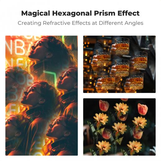 - * 【Fantastisk kaleidoskopeffekt】Dette prismefilteret skaper seks gjentatte bilder som gir unike visuelle effekter og en rik, skarp estetikk for arbeidet ditt.