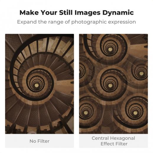 - * 【Ideal for kreativ fotografering】Enten det er landskapsfotografering, portrett eller kunst, tilbyr Central Hexagonal Filter en unik kreativ og visuell opplevelse. Kaleidoscope Prism-filteret gir en unik og kreativ fotoopplevelse. Det forvandler vanlige bilder til psykedeliske, abstrakte og drømmende kunstverk.