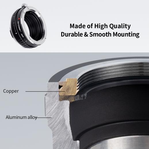 Denne adapteren passer bra, like bra siden jeg ikke tvinger en adapter på linsene mine! A-linsesiden hadde en tett passform. Men det er greit. Redigeringen er av høy kvalitet. Uendelig fokus registrert som forventet, noen få millimeter kort, noe som er normalt for adaptere. Blenderringen har bittesmå, stille klikk når du snur den, et design jeg synes er veldig fint. Jeg har bestilt en annen K&F-adapter, som jeg håper blir like bra.