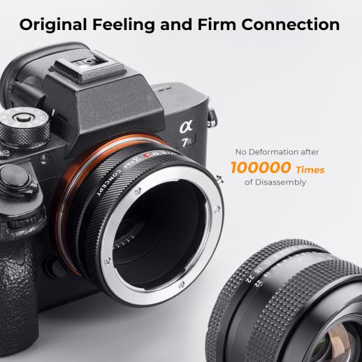 • K&F CONCEPT leverer rundt 300 typer linseadapterringer, noe som gjør forskjellige størrelser på objektiver og kameraer jevnt kompatible. Med et profesjonelt design og håndverk, lar våre linseadapterringer fagfolk fornye gamle linser. Det har aldri vært så enkelt å holde kontakten med alle de kraftige verktøyene dine.