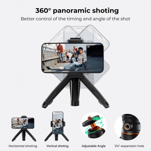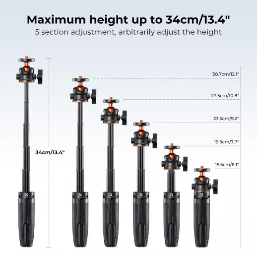 - * Ekspanderbart stativ: Maksimumshøyden er 34 cm og støtter 5-delt benjustering, slik at du kan justere ønsket høyde etter ønske. Dette stativhodet har en belastningskapasitet på 2 kg og er egnet for de fleste speilløse kameraer, mobiltelefoner og andre enheter.