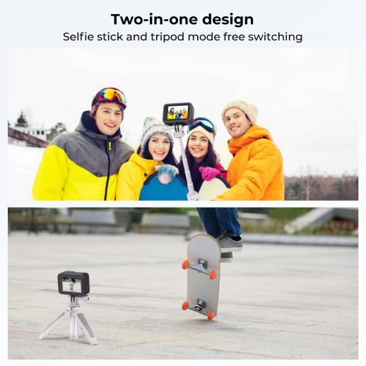 Et hendig lite stativ og en selfiestang. Selv om det ikke er det operative ordet, er det veldig lite og veldig lett og passer kun for et GoPro- eller Insta360-kamera. Sannsynligvis ikke sterk nok for en telefon heller. Ideell å putte i lommen og være klar for enhver handling.