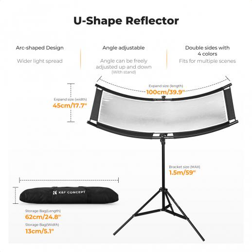 K&F CONCEPT U-formet buet reflektor 100x45cm, 4-i-1 (svart/gull/hvit/sølv) sett med 1,5m stativ for studio