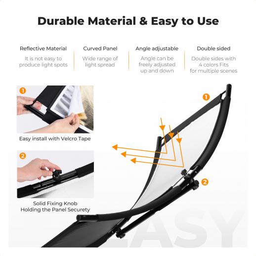 - * 【Flere reflekterende effekter】Reflektoren har to reflekterende stoffer – et svart og sølvfarget og et gullhvitt. Den hvite reflektoren skaper et mykere og mer naturlig lys, mens sølvreflektoren reflekterer lys nærmere sollyset, noe som effektivt lyser opp motivet og øker lysmengden. Den svarte reflektoren absorberer primært lys snarere enn reflekterende, og absorberer lys og reduserer effekten av reflektert lys på bildene dine. Gullreflektoren reflekterer lys med