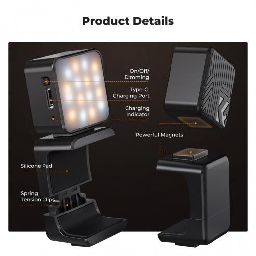 - * 【Justerbar fargetemperatur og lysstyrke】LED-fyllingslyset bruker avanserte LED-pærer med en CRI ≥95, som gir myke og jevne lyseffekter som effektivt lysner og forbedrer hudtonen, slik at du kan se best mulig ut på kameraet. Støtter tre justerbare fargetemperaturer: 3000K, 4500K og 6000K, og tilbyr varmt lys, varmt hvitt lys og kjølig hvitt lys for å imøtekomme ulike tonekrav. I tillegg tilpasser lysstyrkejusteringen i to nivåer seg ulike lysforhold.