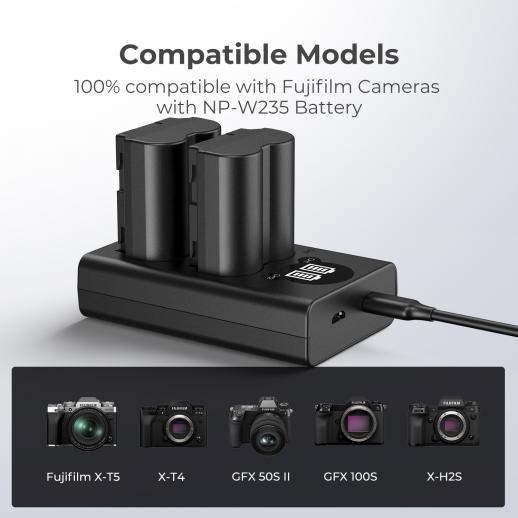 K&F Concept NP-W235 Batterilader med LCD-skjerm, Micro USB og Type-C Lader Lader for Fujifilm X-T5, X-T4, GFX 100S, X-H2S, GFX 50S II, VG-XT4