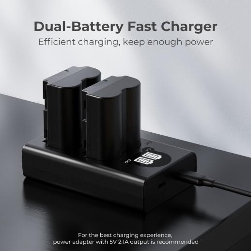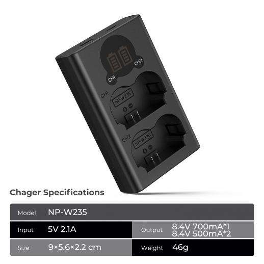 - * Lader med to spor. NP-W235-batterihurtigladeren er utstyrt med mikro-USB og Type-C dobbeltgrensesnitt, mer praktisk å bruke. Merk: Kun Type-C-kabel er inkludert.