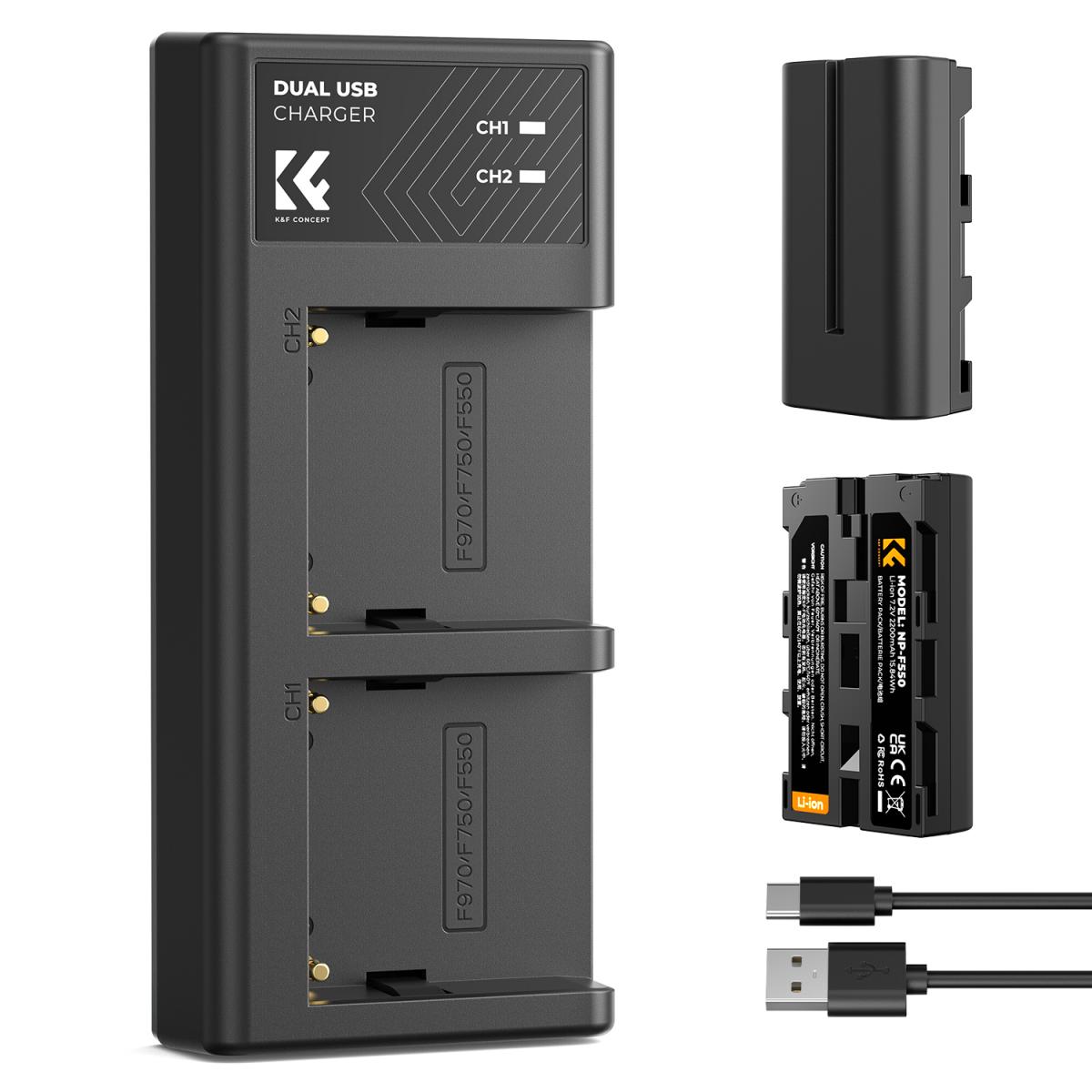K&F Concept 2-pakke NP-F550 batteri- og ladersett Kompatibel med Sony NP-F550, F570, F750, F770, F930, F950, F960, F970 batterier, LED-lys, skjermer og kameraglidere