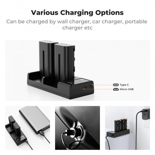 - * 【Bred kompatibilitet】 Kompatibel med Sony-videokameraer som bruker NP-F550, F570, F750, F770, F930, F950, F960 og F970-batterier, samt skjermer og kameravideolys med NP-F-batterier.