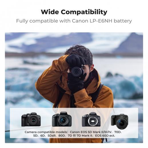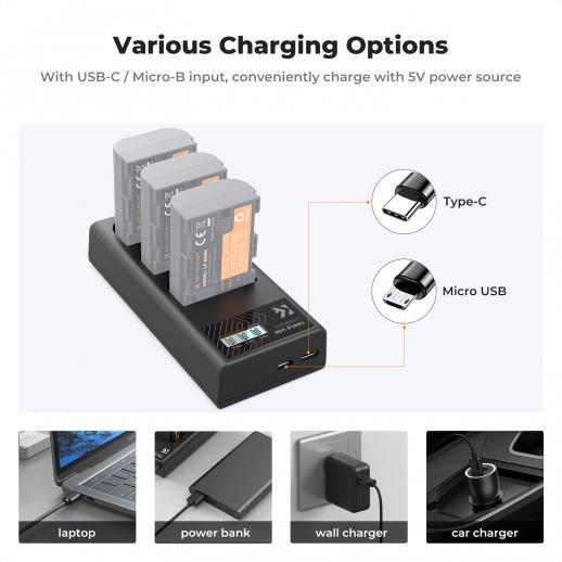 - * 【Flere ladealternativer】 LP-E6/E6N/E6NH hurtigladeren kan lade 3 batterier samtidig eller separat via den bærbare datamaskinen, PC-en, billaderen, veggladeren eller strømbanken.