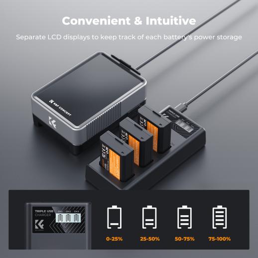 K&F Concept LP-E10 batteri 3-pakning og oppgradert LCD-lader for Canon Rebel T7 batteri, EOS Rebel T7 T6 T5 T100, Kiss X50 X70 X80 X90, EOS 1100D 1200D 1300D 1500D 2000D kamera