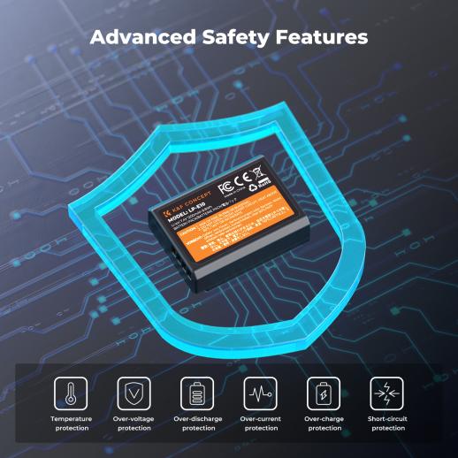 - * 【Flere sikkerhetsbeskyttelser】CE/FCC/RoHS/3C-sertifisert, innebygde flere beskyttelser (overspenning, overstrøm, kortslutning, høy temperatur, overlading). Pakken inneholder 3 x LPE10-batterier, 1 x 3-spors LPE10-batterilader, 1 x USB-C-ladekabel.