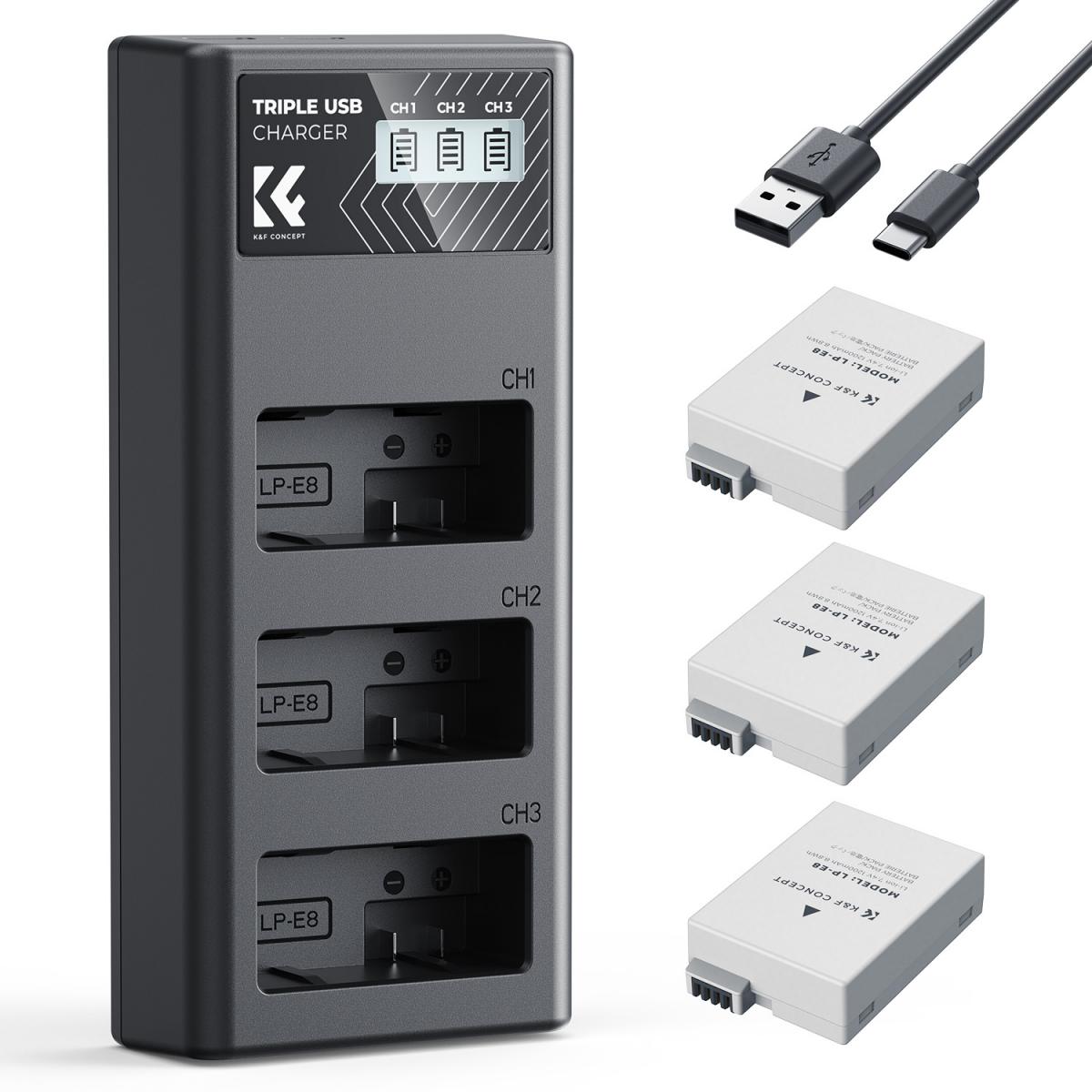 K&F Concept 3-pakning LP-E8 batteri og oppgradert LCD-lader kompatibel med Canon EOS Rebel T2i, T3i, T4i, T5i, 550D, 600D, 650D, 700D, Kiss X4, Kiss X5, Kiss X6 kameraer