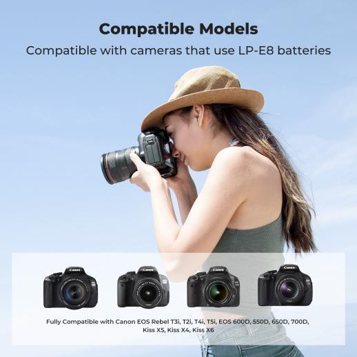 - * 【Full kompatibilitet】 LP-E8 batteriladersettet er fullt kompatibelt med Canon EOS Rebel T2i, T3i, T4i, T5i, 550D, 600D, 650D, 700D, Kiss X4, Kiss X5, Kiss X6 kameraer og andre modeller som drives av LP-E8 batterier.