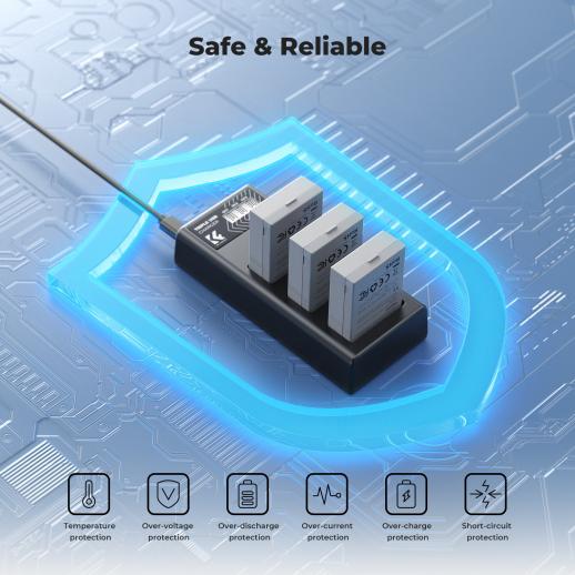 - * 【Sikkerhetsbeskyttelse】CE/FCC/RoHS/3C-sertifisert, innebygde flere beskyttelser (overspenning, overstrøm, kortslutning, høy temperatur, overlading). Pakken inneholder 3 x LPE8-batterier, 1 x 3-spors LPE8-batterilader, 1 x USB-C-ladekabel