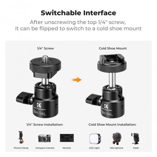 - * 1/4″ skrue og kaldsko 2-i-1-design: Denne superklemmen har et 360° justerbart kulehode med en lastekapasitet på 1,5 kg. Toppen av kulehodet er en 1/4» skrue som er kompatibel med mobiltelefonfester, kameraer, skjermer osv. Toppen av hodet kan reverseres for å bytte til et kaldt skofeste, og deretter kobles til fylllyset, mikrofonen og andre enheter.