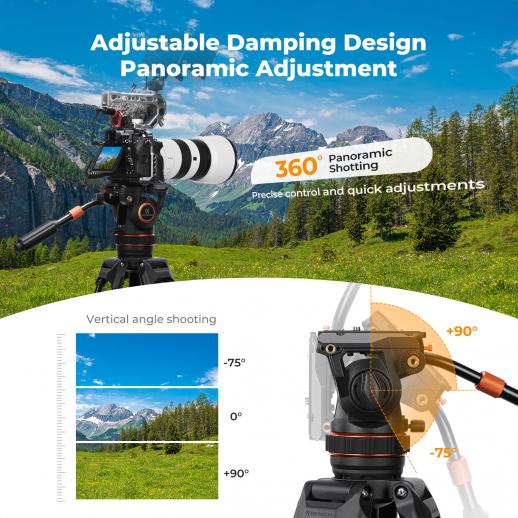 - * 【360° panoramautsikt og jevn vippejustering】Profesjonell hydraulisk demping sikrer jevn 360° horisontal rotasjon og et vippeområde fra -75° til +90°, perfekt for dynamiske videoer. Ingen risting ved filming fra forskjellige vinkler.