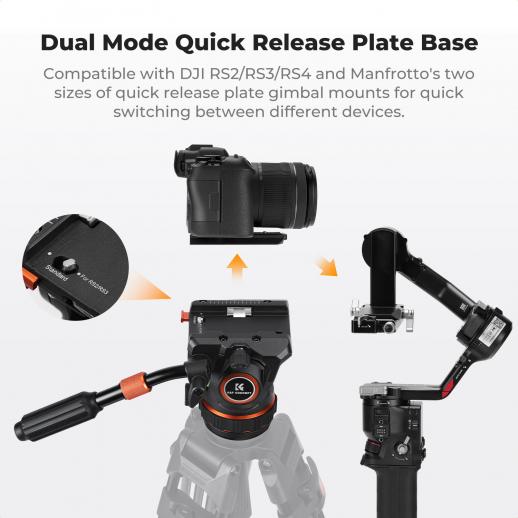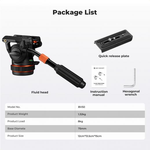 Profesjonelt fluidhode, lett og flytende videohode. Silkemykt og stabilt stativhodefeste. Maks. belastning 8 kg. Stativhode for 360° panorering og -75° til 90° tilt. BV50 K&F CONCEPT.