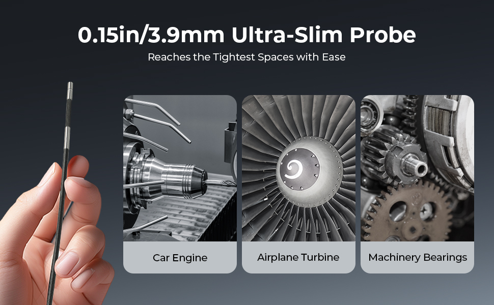 Traditional inspection camera can’t handle extremely narrow spaces—but this one can. Med et 3,9mm (0,15") ultra-slim kamera kan du lett inspisere tett, komplekse områder som bilmotor internasjonale, sparkplugg, flyturbiner og fine mekaniske deler uten hassle.