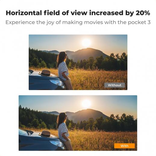 - * Fang opp flere detaljer: Dette vidvinkelobjektivet utvider synsfeltet til Pocket 3-objektivet ditt til 112°. Det beriker visuell historiefortelling ved å ramme inn flere motiver og miljøelementer, ideelt for gate- og landskapsbilder, arkitektur, gruppebilder, sportsarrangementer og store forsamlinger, overvinner et visst nivå av romlige begrensninger, noe som muliggjør fullstendig dekning av store motiver selv i trange omgivelser eller på nært hold.