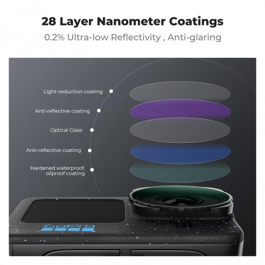 - * 28 flerlagsbelegg: Flerlagsbelagt filter reduserer gjenskinn og lysskjær på en optimal måte, er vanntett, ripebestandig, støvtett og oljebestandig, og beskytter actionkameraobjektivet mot allsidig sollys.