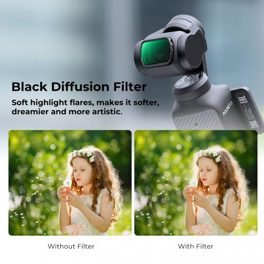 - * 【Black Mist 1/4 Filter】Myke lysreflekser, redusert kontrast. Dette black diffusjonsfilteret 1/4 for Osmo Pocket 3 kan myke opp rynker, fregner og porer i ansiktshuden, noe som gjør den mer delikat, fyldig og vakker. Tåkefilmeffekten kan realiseres bedre, og filmeffektene vises drømmende.