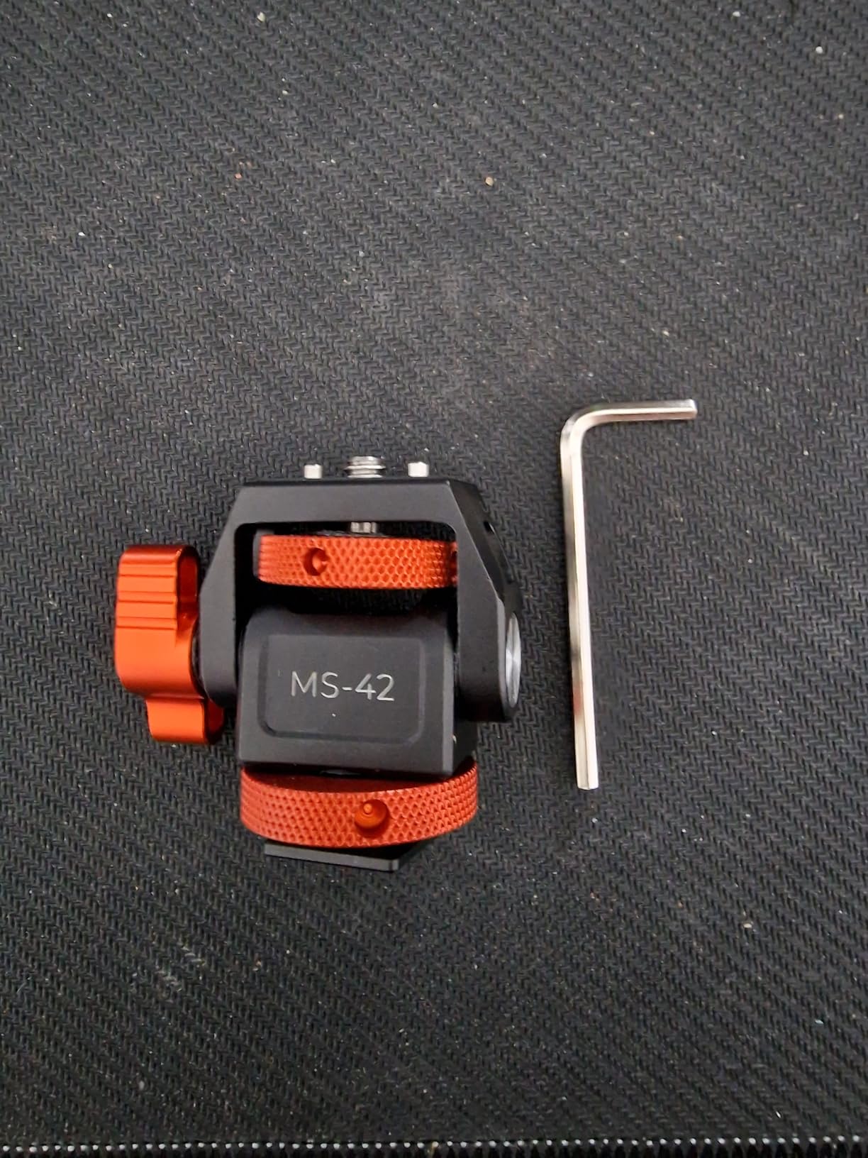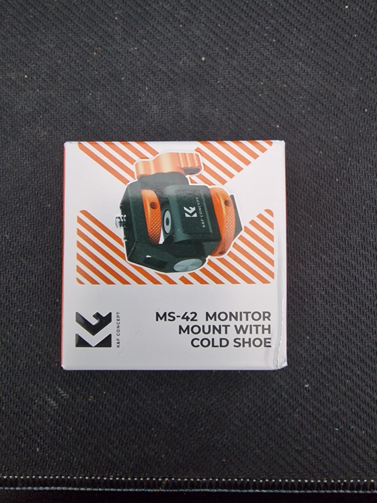 K&F Concept kamera/skjermfeste ble levert meget profesjonelt pakket i en fargetrykt pappeske med K&F Concept-logoen og viser et bilde av produktet. Enheten er laget av svartmalt aluminiumslegering med hvit grafikk og kontrasterende oransje klemmer. Den todelte tiltjusteringen tillater en tilt på 180° og en svinging på 360°. Alle deler kan enkelt flyttes og låses. Enheten har en kaldskoadapter på bunnen for tilkobling til et kamera eller bur, et 1/4"-20 gjenget hull for den magiske armen eller stabilisatoren, og en 1/4"-20 skrue på toppen for å feste en skjerm. Et veldig allsidig feste for små kameraer og skjermer.